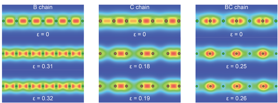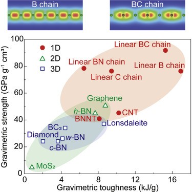线性原子链是一种极致物质形态,其化学键全部沿轴取向,因而具有优异抗拉力学特性。线性碳链 (linear carbon chains) 此前曾被认为是已知最强最韧材料,例如其比抗拉强度分别为石墨烯与金刚石的1.5和3.2倍。然而,线性碳链具有派尔斯不稳定性,其键合结构分化为单三键交替,这种分化随拉伸应变会进一步加剧,其断裂力学性能由最弱化学键决定。