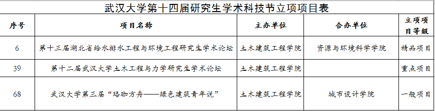 另外,与资环学院合办的“第一届华中高校研究生诚信宣言演讲活动”获得“精品项目”;与电气、水利水电、外国语、新传以及资环学院合办的“‘学海扬帆,诚信领航’学术诚信主题知识竞赛”获得“重点项目”;我院主办的“武汉大学第三届‘珞珈方舟——绿色建筑青年说’”获得“一般项目”,同样可喜可贺。