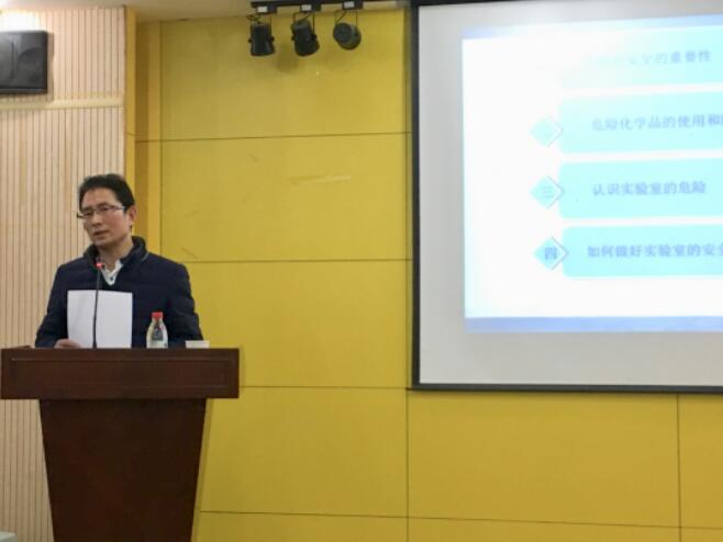何勇老师分别从实验室注意事项和安全意识等方面对所有学生进行了宣传教育。实验室是学习和进行科研的重要场所,实验室仪器的使用、实验室化学药品的处理以及大型起重机等其实存在了许多的安全隐患。何老师就平时的工作经验和学生在做实验时容易发生的安全问题对大家进行了宣传提醒,包括危险化学药品购买需要申报、大型起重设备使用自身安全隐患以及实验室用电安全、火线零线的确认等,使同学们意识到了平时做实验时时刻需要注意的问题。