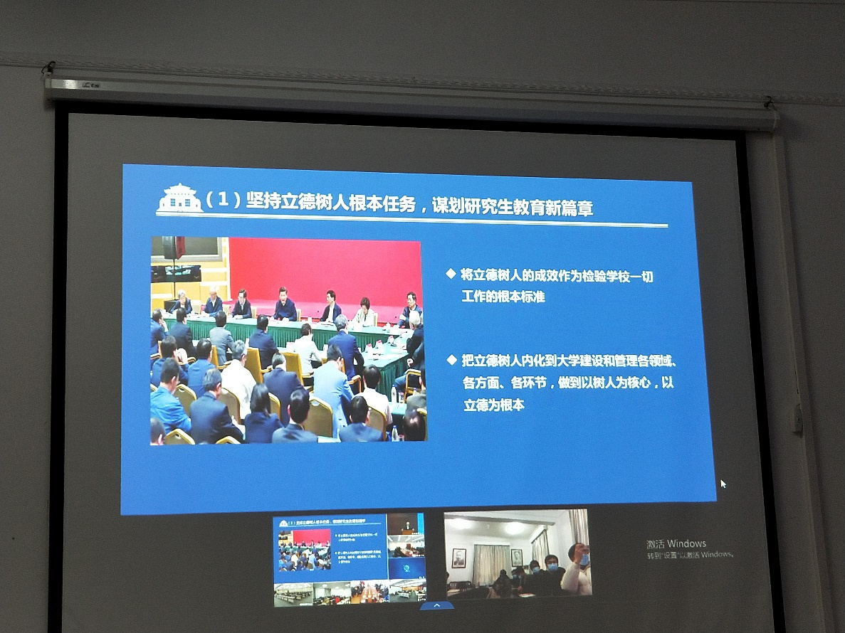 最后,党委研究生工作部楚部长作“实施 ‘鲲鹏提质工程’,奋力谱写研究生工作高质量发展新篇章”的报告。报告强调了研究生思想政治工作的独特性和重要性,并讲述了现在研究生思政工作的形势任务、问题挑战、思路方向。然后介绍了“鲲鹏提质工程”的特点和框架结构,其重点任务是:育人体系、育人机制、服务保障、工作方法四大提质工程。最后,报告讲述了此工程的保障落实情况。