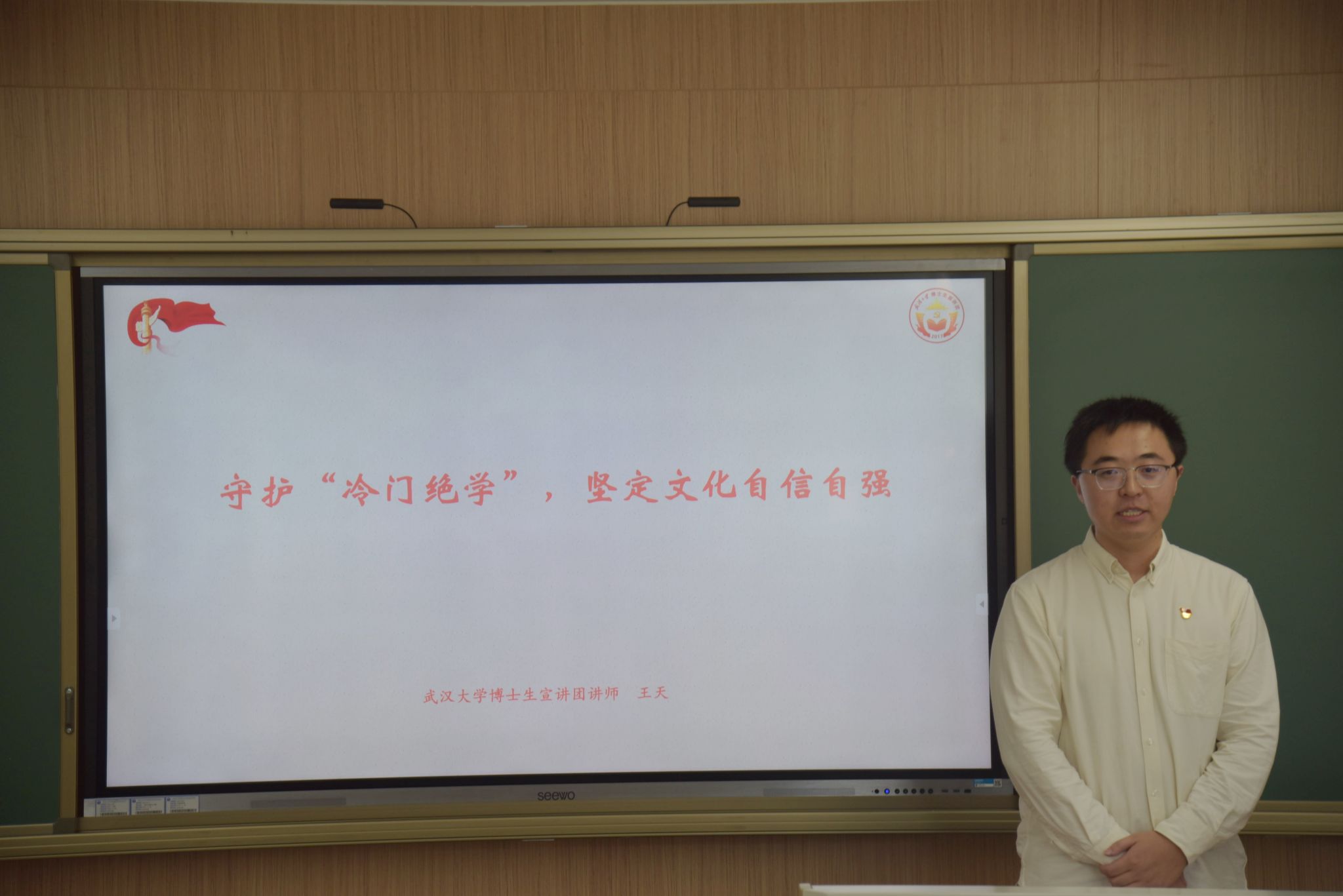 随后,武汉大学博士生宣讲团讲师王天同学进行了题为《守护“冷门绝学”,坚定文化自信自强》的宣讲,宣讲围绕“传承、创新、坚守”三个关键词,结合睡虎地秦简、老官山汉墓出土织机、殷墟出土青铜器等重要文物和著名考古学家郑振香先生的感人事迹,阐述了“冷门绝学”对于理解中华优秀传统文化的重要意义。