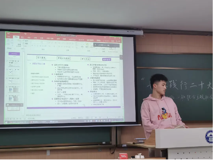 接着,是党的二十大精神学习,勒文瑄同学为同学们讲解了新时代十年的伟大变革和我们新时代青年人才的战略机遇,勉励大家以身边优秀的同学为榜样,刻苦学习,不懈奋斗践行党的二十大精神。