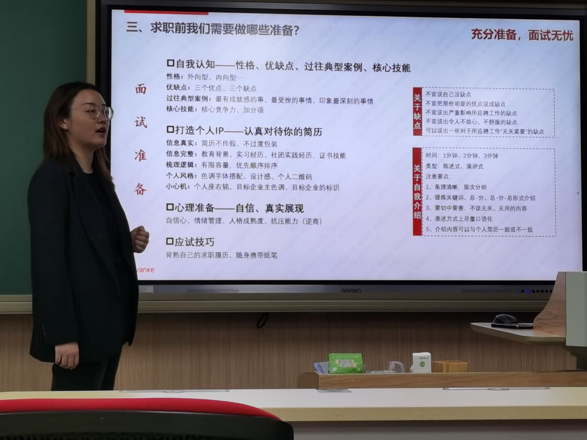 王楚奇在讲座中主要从三个方面给予新生建议。其一是广泛的了解职业,明确自己将来从事职业是否局限于自己专业。其二要了解自己在工资待遇、工作氛围、就业保障、晋升机遇等方面的需求,从而选择适合自己的工作,王楚奇还讲述了企业精神和个人能力发挥在企业选择方面的重要性。她说这是一个心灵的时代,求职早已不仅仅是一种谋生的手段,要根据自己的热爱去选择职业。其三以万科为例,介绍了专场式、压力式、情景式等面试模式,以及面试中的小技巧,包括面试礼仪以及一份具有亮点的简历,并呼吁新生根据自己想面试的职业,尽早塑造自己的亮点,重要的是真实、完整以及对问题提前准备。