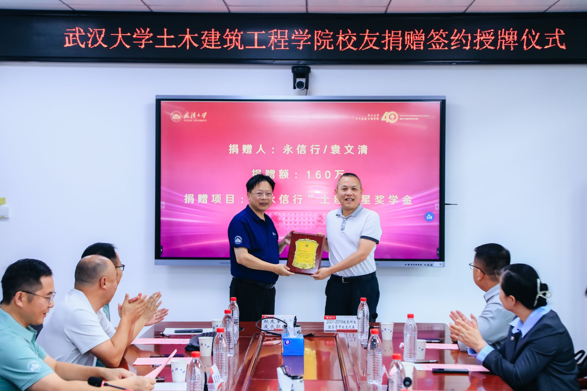 四秩芳华已逝,同窗笑语犹闻。10月5日,det365APP40周年院庆系列活动之校友及友好单位捐赠签约授牌仪式在结构楼一会议室举行。武汉巨成结构集团股份有限公司董事长高作平、深圳校友会水电土木工程分会常务副会长马争、湖北省飞迈科技有限公司总经理张治家、湖北永信行房地产土地资产评估咨询公司董事长袁文清、鼎正工程咨询股份有限公司董事长王雁然、正隆众智建设集团总经理曾晶、中建八局华中公司人力资源负责人林小森、武汉山海桥梁设计咨询有限公司总工程师刘烈坤应邀出席。出席捐赠仪式的还有设立“建树”成长互助励学金的捐赠校友邢旺、蒋亚龙、徐贞珍、张泳清、刘东锋、高菲、陈雅泽、张懋、杨浩、包永胜、马清华、曹一胜、卢恩赦、陈敏、阮志、皮靖宇、汪洪昌。武汉大学校友事务处与发展联络处副处长叶琳娜、det365APP党委书记杨旭、党委副书记王忠海、党委副书记刘光明、副院长肖娴娴、教授方正,校友工作秘书伍阳等出席捐赠仪式。捐赠仪式由det365APP党委书记杨旭主持。