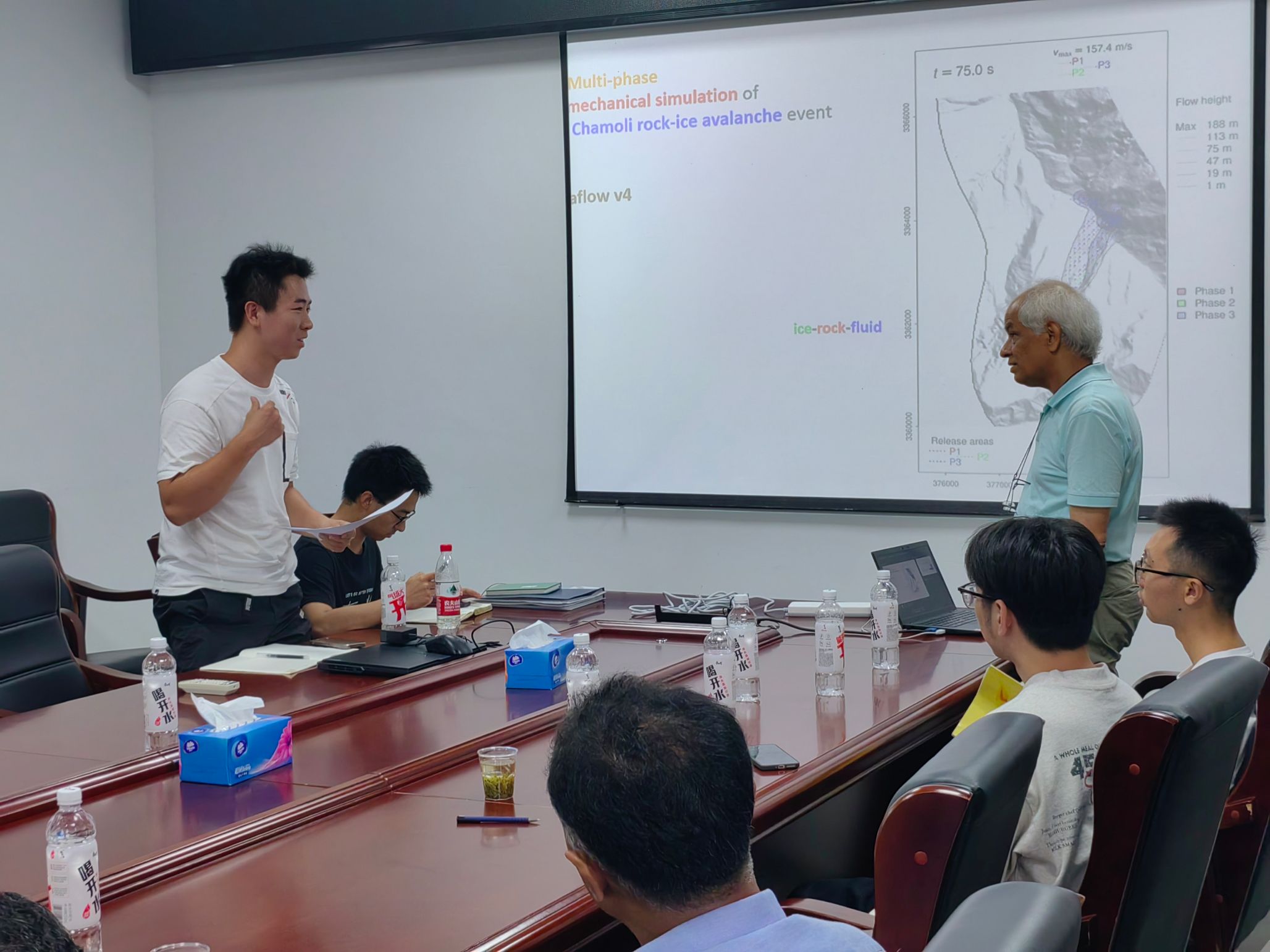 泥石流、雪崩、冰湖溃决洪水(GLOF)及水库中的重力流动等多相流建模和应用是当今研究的热点和难点问题,在此次讲座中,Shiva教授团队的Parameshwari副教授首先介绍了复杂的流动结构与多相质量流的相互作用及其应用,Chet助理教授进一步介绍了高粘度流体的室内试验及相关建模难点;最后由Shiva教授讲解了多相流计算的物理力学方程以及最新开发的温度相关的多相流数学描述,并展示了团队开发的复杂多相流动的高级建模平台r.avaflow及其工程应用。