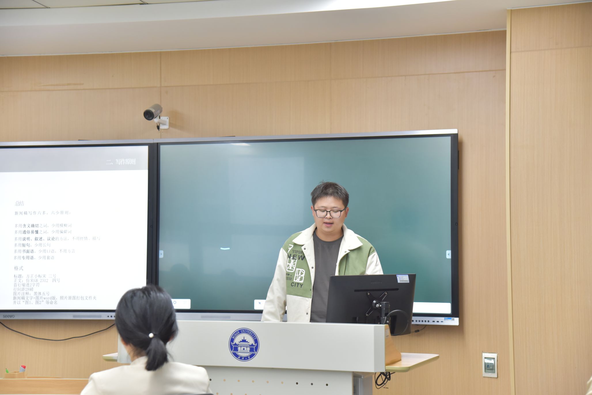 紧接着,研究生会主席团成员代恒宇同学为大家分享了文稿撰写方面的宝贵经验。他从活动类型出发,详细阐述了不同类型活动文稿的写作特点,并总结了写作时应遵循的基本原则。在谈到信息获取时,他强调了准确、全面地收集活动相关信息的重要性,这是确保文稿内容真实可信的基础。代恒宇同学详细讲解了文稿的格式要求,包括字体、字号、段落排版等方面的规范,以确保文稿的专业性和易读性。在缀文规范方面,他提醒大家注意语言的准确性和表达的清晰性,避免冗长和晦涩的表述。代恒宇同学还特别指出,在撰写一些非严肃性的活动标题时,可以适当地采用“标题党”的手法,以吸引读者的注意力,但需注意保持标题与内容的关联性,避免误导读者。