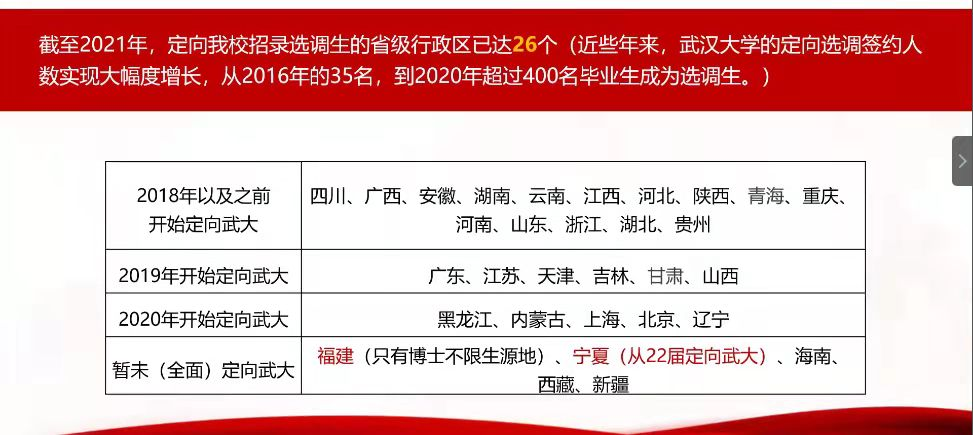 第一部分是“选调生是什么”,主讲人以幽默的语言,详实的数据,具体的案例清晰地说明了选调生的定义、报考选调生的条件、公务员和选调生的区别和联系、定向选调和非定向选调的具体情况和区别,截至2021年,定向我校招录选调生的省级行政区已经有26个。在2020年,超过400名毕业生成为了选调生,为中国建设做出自己的贡献。